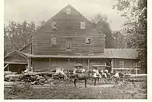 By the late 19th and early 20th century Hooks Mills was an established community, with an inn serving the patrons of the mill, a blacksmith shed and house, the mill residence, and the Captain David Pugh House. A 1903 photograph on display in the Capon Bridge Museum shows the mill in a state of early decline. In the photo Henson Hook, the mill operator, is seen with his hand on the wheel of a horse-drawn wagon. The mill also served as the community's post office, and the mill race served as a place where the local population harvested ice in the winter. Nothing remains of the mill, which was swept away in a flood in the late 1930s, but the traces of the mill race and a few scattered foundation stones.