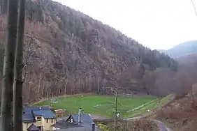 With a height of 536.1 m above NN, the Hopfenberg forms the eastern boundary of the Emse valley within the municipality of Winterstein. The hill, which is cleared on its western and northern flanks, was used in the Middle Ages for the cultivation of hops, from which the hill derives its name.[1] The rocky southern face of the Hopfenberg towers over the Sembach valley by about 125 metres. The Kilianstein rock formation in the east of the valley recalls the conversion of local pagans by the missionary, St Kilian. The rock face on the Treppenstein is also impressive; here there used to be a quarry whose rock was used in the construction of forest tracks.[2]