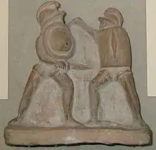 The oplomachi were a designation or possibly a class of Roman gladiator with relatively little mention in literary sources. They are often identified with the similarly named hoplomachus, but literary mentions do not seem to relate the two, despite the similarity of the names. According to Justus Lipsius, an oplomachus was one of two designations of Samnite; he conjectures that Samnite variants were called oplomachi when matched against a Thracian, and a secutor when facing a retiarii.[4] Though historical accounts identify them primarily as an opponent of the Thraex, they appear in a Pompeian list as fighting not only against Thraeces, but against Murmillones and Dimachaeri as well.[5]