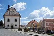 The Church of Saints Peter and Paul dates from the 15th century. In the early 18th century, it was baroque reconstructed and extended.[10] The 38 m (125 ft) high bell tower was rebuilt in 1852 and today is open to the public as a lookout tower.[11]