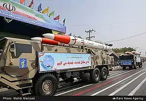 Hormuz-1 (Persian: موشک هرمز-۱) is an Iranian anti-radar ballistic missile[8] which has the capability of destroying radars on aircraft carriers, Patriot missile sites on land, and "search radar sites", according to Hajizadeh, commander of the Air Force of the Islamic Revolutionary Guard Corps).[9]
