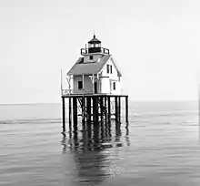 The second light was built on the island in 1887, a square house with dormers and a lantern on the roof.[2] It too was moved in 1900 (the old abandoned light having succumbed to a storm in 1893), and was utterly destroyed by the 1906 Mississippi hurricane, killing keeper Charles Johnsson, his wife, and his daughter.[4] Johnsson had been offered a ride with his family to safety but had refused, citing his duty to keep the beacon lit; his body was found after the storm, but those of his wife and daughter were never recovered.[4]