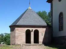To the empty tomb some steps lead down, ending in front of a contoured sandstone frame at the foot of the tomb niche. It is a window opening through which the pilgrims could touch the shrine of the saint. The tomb is considered the oldest known testimony of ecclesiastical architecture in the Palatinate.[12][13]
