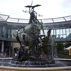 The Hornsby Water Clock, titled Man, Time and the Environment is a piece of kinetic sculpture, a decorative fountain and a functional clock in the Florence Street pedestrian mall in Hornsby, New South Wales, Australia. Unveiled in 1993,[1] the sculpture was designed and engineered by Victor Cusack and constructed of bronze, stainless steel and glass by Victor and his foundry floor manager Rex Feakes.[2] Construction, including alterations to the mall, cost over A$1 million and took two and half years; thereafter, chicken bones and other carelessly discarded items caused many breakdowns before the water filtration system was upgraded.[3]