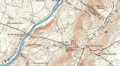Portion of the 1944 Berryville, Virginia topographic map showing the horseshoe curve in Virginia State Route 7 on the west descent of Blue Ridge Mountain.