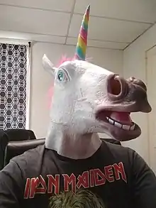 The horse head mask is a latex mask representing a horse head originally manufactured by novelty purveyor Archie McPhee, and now widely available from other manufacturers. It covers the entire head and is typically part of a Halloween costume, or is worn at other times to be funny, shocking, incongruous, or hip, or to disguise one's identity. It has also become an internet meme.[5]