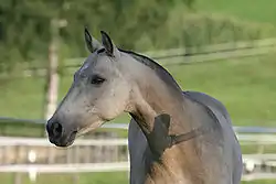 Traditionally, the mane is braided on the right side of the neck. This is still the standard for show hunters in the United States and eventers, although dressage horses are commonly braided on either side. It was also traditional in the USA that male horses would have an odd number of braids, and even number for mares.[4] However, this rule is rarely, if ever, followed by modern braiders.
