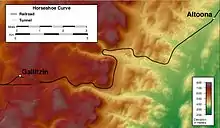 ![]() Orthophoto of the Horseshoe Curve. Trains headed counterclockwise around the curve are ascending. The visitor center and observation park are at the apex of the curve, and a reservoir is in the valley spanned by it. | |