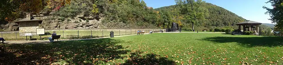 The Railroaders Memorial Museum in Altoona manages a visitor center next to the curve.[47] The 6,800-square-foot (632 m2) center has historical artifacts and memorabilia relating to the curve and a raised-relief map of the Altoona–Johnstown area.[38] Access to the curve is by a 288-foot (88 m) funicular or a 194-step stairway.[18][47] The funicular is single-tracked, with the cars passing each other halfway up the slope; the cars are painted to resemble Pennsylvania Railroad passenger cars.[38] A former "watchman's shanty" is in the park.[48] Horseshoe Curve is popular with railfans; watchers can sometimes see three trains passing at once.[47][49] In August 2012, the former Nickel Plate Road (NKP) steam locomotive No. 765 traversed Horseshoe Curve: the first steam locomotive to do so since 1977, while deadheading to and from Harrisburg as part of Norfolk Southern's 21st Century Steam program.[50] NKP 765 returned to the curve in May 2013 with public excursion trains from Lewistown to Gallitzin.[51]