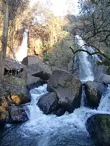 The Horseshoe Falls of South Africa are located 4 km off the Old Lydenburg Road along the Sabie River in Mpumalanga. These unusual falls, although not very high, are horseshoe shaped and have been declared a national monument. A short walk through an attractive landscape brings the visitor to the cascade-type falls. Here one also has the opportunity to spot some of the local birdlife or other wildlife. Although it is easy to navigate to, a small fee is charged to get into the park where this beautiful attraction may be enjoyed.[1] Horseshoe Falls is also a popular venue for trout fishing.