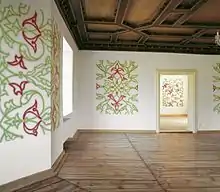 In 2003, Keining received a commission for paintings to be applied directly on the plaster walls of rooms in the Mariakirchen moated castle near Arnstorf, Germany. Since oil does not adhere permanently to plaster, a new technique was necessary. In order to distort the contours Keining used a spray gun and synthetic resins. He created eight wall paintings (about 200 cm x 150 cm) with a distinct ornamental structure. Due to his positive experiences with this material and technique Keining began to work with a spray gun and synthetic resin on canvas also.