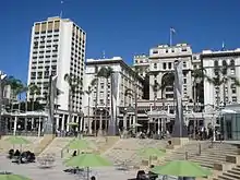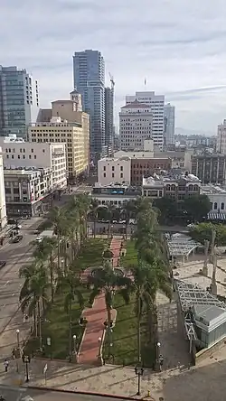 Horton Plaza Park is an outdoor venue located in the heart of downtown San Diego, which had its grand opening on May 4, 2016. Located on the corner of 4th Avenue and Broadway, the plaza preserves the history and integrity of the original Horton Plaza, while adding key features to enhance the area. In addition to restoring the Broadway Fountain, the park includes an amphitheater for live music acts, retail Pavilions and a new, interactive fountain.[1] The plaza was designated a historical landmark by the City of San Diego on March 19, 1971.[2] The city-owned park was designed by landscape architect Walker Macy and built by Civic San Diego.[3]