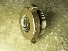 A "boss" ground joint coupling valve hose coupling, primarily used for compressed air or steam. It consists of a stem, wing nut and spud. It seals as a soft copper seat located in the spud is drawn against the stem by tightening the wing nut.