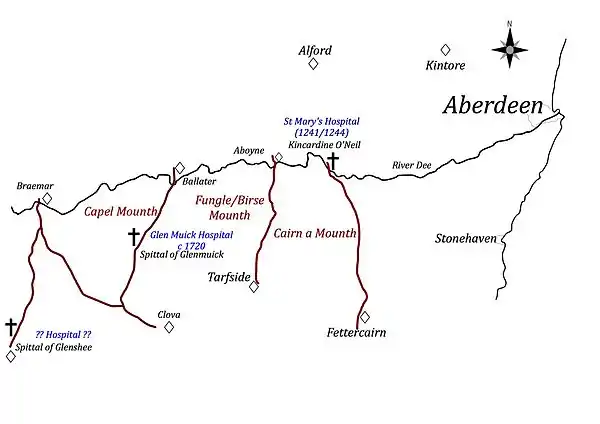 These paths had stopping places for travellers and as a result a number of the hospitals were located adjacent to or on these routes. In addition, where paths crossed rivers by bridges, fords or ferries, traveller's inns were located. It is notable that the Mounth passes also linked Castles across the whole of Scotland. This is clearly shown in the north east. It appears that the location of Hospitals on Mounth paths (e.g. Kincardine O’Neil, Spital of Loch Muick and perhaps the hospital at Boat O’Brig on the River Spey) were associated with travellers between settlements and castles. Simpson (1928) provides a detailed analysis of the Castles of Mar and their association with Mounth paths.[24] The Cairnnamount path links Castlehill, Kincardine O’Neil and Lumphanan castles.[25] The Capel Mounth, after traversing Loch Muick, passes Kinord Castle and the Loch Davan Motte before running past Migvie Castle. A western branch of the Capel Mounth path passes Loch Callater – to the west of Loch Muick – to Kindrochit and Braemar castles before leading towards Corgarf Castle.