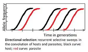 If an allele provides a fitness benefit, its frequency increases within a population – selection is directional or positive. A selective sweep is a form of directional selection where the increase in frequency eventually leads to the fixation of the advantageous allele and other alleles near it. The process is considered to be slower than negative frequency dependent selection. It may produce an "arms race", consisting of the repeated origin and fixation of new virulence traits in the parasite and new defence traits in the host.[1]