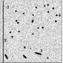The simulated image with stars and other sources (legend: No. 1 — hot pixel, No. 2 — bad column, No. 3 — cosmics, No. 4 — star).