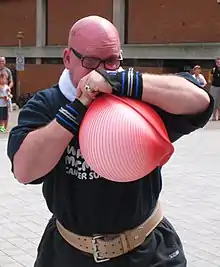 Blowing up a hot-water bottle is usually performed to impress a crowd. It requires significant lung capacity as well as chest and abdominal strength. It is regarded as potentially hazardous because of the risk of harm to the eyes and the possibility of the contained air rushing back into the lungs and causing damage or, reportedly, death.[1] Former world record holder Brian Jackson has claimed that he knows of at least five deaths resulting from the practice, although this is unconfirmed.[2] Georgian athlete Jemal Tkeshelashvili has demonstrated two variations on the traditional method: blowing the bottle up with his nose, and blowing one up while somebody sits on top of it.[3][4]