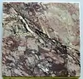Hotavlje is best known for its stone quarries, which started operating in the mid-19th century.[5] Cordevolian limestone[6][7] (marketed as Cordevol limestone, also referred to as hotaveljski marmor 'Hotavlje marble') is a greyish-pink and red mineral. It has an attractive mottled appearance with irregular patches of grey, opaque yellow, or scarlet dolomite in small rhomboid crystals, white and coloured calcite veins, and frequent remnants of fossilised algae. Its colour and the high gloss of its polished surface make it a popular material and it was traditionally used in buildings in the area. It is quarried by the local company Marmor Hotavlje, which employs 150 workers and over the years has developed into one of Slovenia's leading stone-cutting companies, using the local quarries to the north of the settlement as well as travertine and tuff quarries in Jezersko and limestone breccia in Bosnia and Herzegovina. The marble is also used for restoration work in registered buildings. The replica of the Robba Fountain in the main town square in Ljubljana was made by the company and it has supplied cut and carved marble to projects abroad such as the Saint Sava's Church in Belgrade.[8]