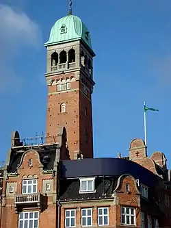 The three-wing building is constructed in red brick with granite rustication on the ground storey. The most distinctive feature of the building is its tower which stands 50 metres tall and is capped by a copper roof.[1]