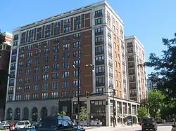 The Hotel Del Prado is a historic apartment hotel at 5307 S. Hyde Park Boulevard in the Hyde Park neighborhood in Chicago, Illinois. Built in 1918, it is the oldest of the several apartment hotels built in Hyde Park in the late 1910s and 1920s. Hyde Park was growing in both population and prestige at the time, creating a need for additional housing. Apartment hotels were a fashionable choice, as they combined the amenities and prestige of hotels with the affordability of apartments.[2] The Hotel Del Prado had 198 apartments and included commercial space on its first and second floors. Its Neoclassical design includes Palladian windows on its lower floors, terra cotta trim throughout its exterior, and carved American Indian heads atop terra cotta columns.[3]
