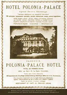 The Polonia Palace Hotel was developed by Count Konstanty Przedziecki,[1] a member of one of Poland's oldest aristocratic families,[2] whose grandfather Aleksander had constructed the nearby Hotel Europejski. The name Polonia Palace was chosen during the Period of Partition to have a strong patriotic element.