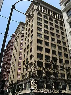 The building has 14 stories, a steel frame, and a buff brick and terra cotta exterior. It is the only building by the firm to contain an exterior light court. The building also has a 14-story addition on its northeast side, designed by Eames & Young, built in 1905 and adhering to the original design.[1]