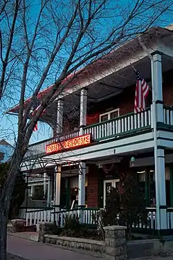 Upon opening, the hotel was advertised as "attractive small hotel (with) 30 rooms and 16 baths, wide verandas upstairs and down, attractive lobby, hot and cold water in all rooms, night and day phone service with buzzers in all rooms, excellent steam heat, free parking, one-half block from Plaza." The original rates were $1.50 per night for a single and $2.50 for a double.[1] The hotel underwent a renovation during the 1980s, which allowed the property to keep many of its original features, while giving its amenities an upgrade.[14]