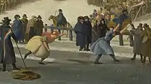 Four years later, on 20 January 1809, Bouma competed again in the women's race in Oldehove on the stadsgracht. At this competition, 64 unmarried women participated. Bouma made it to the final, in which she defeated Maike Meyers from Heeg and won a golden oorijzer.[5] Along the ice there were huge crowds watching the races. Johannes Rienks wrote a poem about this competition,[5] and Nicolaas Baur made two oil paintings depicting the finish of the final race. For greater ease, skaters had thrown off their cloaks. This is also visible in Baur's painting, where he painted the finalists with bare arms and a jettisoned cloak on the ice. The women's bare arms caused a lot of commotion as they were seen as obscene, and so it was the last women's competition for many years until 1823.[6][2] Bouma stopped competing after her victory in 1809.[2]