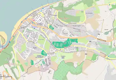 During the 1870s a casino and baths called the Kursaal was built in Beuzeval-lès-Bains.[26][27] It was built of wood on stilts and was situated between the William the Conqueror column and the PN83 level crossing. This complex of buildings, all in wooden planks, was built to carry two functions, a casino and baths as well as an entertainment centre for tourists. It was named the Kursaal, a word of Germanic origin, often translated in French and English as casino.[27] Unlike Houlgate casino, there were gambling tables. It contained warm baths and a guarded beach but never succeeded in becoming a bona-fide casino. The Kursall was demolished by the Germans in 1941.[27]