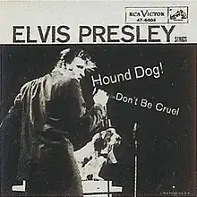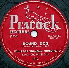 "Hound Dog" is a twelve-bar blues song written by Jerry Leiber and Mike Stoller. Recorded originally by Big Mama Thornton on August 13, 1952, in Los Angeles and released by Peacock Records in late February 1953, "Hound Dog" was Thornton's only hit record, selling over 500,000 copies, spending 14 weeks in the R&B charts, including seven weeks at number one. Thornton's recording of "Hound Dog" is listed as one of the Rock and Roll Hall of Fame's "500 Songs That Shaped Rock and Roll", and was inducted into the Grammy Hall of Fame in February 2013.
