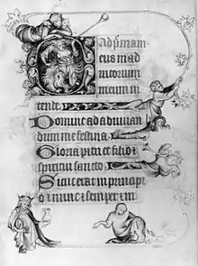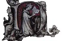 Although there are dissenting opinions, the book is generally believed to be the work of the leading Parisian illuminator, Jean Pucelle (or Jehan Pucele). It is usually identified with the book mentioned by Queen Jeanne in her will, in which she leaves to Charles V "un bien petit livret d'oroisons que le roy Charles, dont Dieu l'ame, avoit faict faire pour Madame, que pucelle enlumina" ("a very small prayer book which King Charles, may God protect him, had made for Madame, which Pucelle illuminated"). The identification of the patrons, illuminator and the date assigned to the work all largely depend on identifying this book with the manuscript in New York, as does any clear conception of what Pucelle's personal style was.[9] However this refers to a prayer book not a book of hours, and it has been doubted that this imprecision would have been likely in such a context. In addition none of Jeanne's heraldry appears in the book, unlike two other royal manuscripts made when she was queen, her Coronation Book and a breviary.[10]