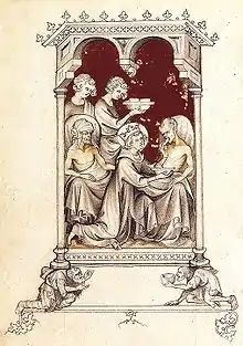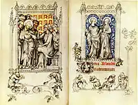 The miniatures use a variety of grisaille drawing in pen known (or at least so called in an inventory that included this work) as "de blanc et noir" and tempera for the other colours. Using both grisaille and colour together is a technique known as “camaïeu gris”. The full-page paintings include cycles of what are always the most commonly found phases of the Life of Christ, the Passion and Infancy. These illustrate the Hours of the Virgin, which is found in some other books of hours, but most unusually they are arranged on facing pages showing a scene from the Passion on the left and from the Infancy on the right, with eight pairs of scenes.[4] However such an arrangement is often found in the ivory diptychs that were being produced in great numbers in Paris at this period.[5] Another cycle shows nine scenes from the life of the Saint-King Louis IX of France decorating the office dedicated to him. Saint Louis was the great-grandfather of both Queen Jeanne and her husband Charles IV, who were first cousins.