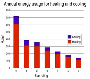 A 5-Star rating indicates that a building achieves a high level of thermal energy performance, and will require minimum levels of heating and cooling to be comfortable in winter and summer. Houses which achieve a 5 star rating, compared to the average 2 star home,[7] should be more comfortable to live in, have lower energy bills, and costs to install heating and cooling equipment should also be lower.