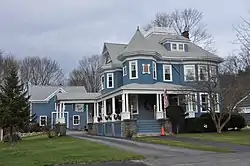 The House at 52 Oak Street in Wakefield, Massachusetts is one of the most elaborate Colonial Revival houses in the Greenwood section of town. The 2+1⁄2-story wood-frame house was built in the 1890s. It has significant Queen Anne styling, including a turret and wraparound porch, but porch details such as the multiple columns on paneled piers are Colonial Revival in style, as are the hip-roof dormers. The house was built by Henry Savage, a developer with ultimately unsuccessful plans to develop the Greenwood area residentially in the 1880s.[2]