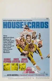 House of Cards is a 1968 American neo-noir crime film directed by John Guillermin and starring George Peppard, Inger Stevens, and Orson Welles. Filmed in France and Italy, it marked the third time that Peppard and Guillermin worked together (they had previously collaborated on the 1966 film The Blue Max) then PJ.[1]
