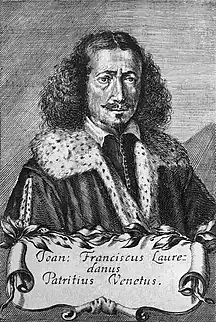 Giovanni Francesco Loredan, born in 1607, was a writer and politician. He was born in Venice as the son of Lorenzo Loredan and Leonora Boldù. When both of his parents died while he was very young, he was raised by his uncle Antonio Boldù and had as his teacher Antonio Colluraffi.[95][96]