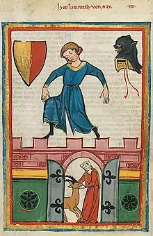 The earliest mention of a member of the family is in 1137/39 with Eberhard de Sacco. In 1168, they were granted a fief over the Misox valley, probably as a reward for their support of the Hohenstaufen family. The founder of the line was Albrecht of Sax who first appears in a record in 1188. His brother, Heinrich reorganized the administration of the Abbey of St. Gall and brought it under their authority. Albrecht's sons, Ulrich (first mentioned 1204, died 23 September 1220) and Heinrich (born around 1180, last mentioned 31 March 1247) became the abbot and vogt, respectively, over the Abbey of St. Gall. Between 1208 and 1213 they became vogts over Disentis and Pfäfers Abbeys. In 1212 they supported Frederick II in his bid to become Emperor and gained extensive land and wealth from him. To protect their expansive holdings, the family built Clanx Castle in Appenzell, Hohensax Castle in Sennwald and Mesocco Castle in Mesocco in Graubünden.[1][2] In 1220, they expanded their southern holdings into the Leventina and Blenio Valleys.[3] The next 28 years marked a high point in the family's power. In 1248, the family holdings were divided between two of Heinrich's grandsons. The southern holdings in Graubünden and Ticino as well as Clanx Castle and Pfäfers Abbey were inherited by Heinrich (first mention 1235, last mention 1258) and Albrecht (first mention 1236, last mention 1275), who became the heads of the Sax-Misox line. The northern estates around Hohensax and St. Gallen were inherited by Ulrich (first mention 1236, last mention 1257) who founded the Hohensax line.