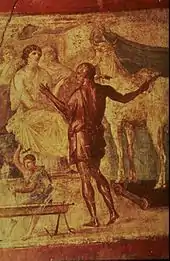 The House of the Vettii is a domus located in the Roman town Pompeii, which was preserved by the eruption of Mount Vesuvius in 79 AD. The house is named for its owners, two successful freedmen: Aulus Vettius Conviva, an Augustalis, and Aulus Vettius Restitutus.[1] Its careful excavation[2] has preserved almost all of the wall frescos, which were completed following the earthquake of 62 AD, in the manner art historians term the Pompeiian Fourth Style. The House of Vetti is located in region VI, near the Vesuvian Gate, bordered by the Vicolo di Mercurio and the Vicolo dei Vettii. The house is one of the largest domus in Pompeii, spanning the entire southern section of block 15.[3] The plan is fashioned in a typical Roman domus with the exception of a tablinum, which is not included. There are twelve mythological scenes across four cubiculum and one triclinium. The house was reopened to tourists in January 2023 after two decades of restoration.[4]