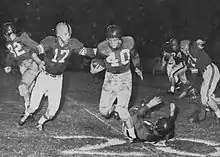 Hal Lahar was announced as Houston's next head coach on January 18, 1957.[17] Lahar came from Colgate University, where he had served as head coach for five seasons.[18] In college, Lahar had played for the Oklahoma Sooners, where he was a part of the school's first bowl team.[19] Under Lahar, during the 1958 season, the Cougars became a nationally recognized offensive leader, as the team scored a combined 117 points in their first three games. Lahar's offensive strategy was best characterized as Split-T.[20] After winning the Missouri Valley Conference titles again in 1957 and 1959, Lahar left UH in 1961 and headed back to Colgate University.[19]