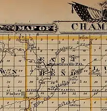 Houstonville, an extinct village, was in the vicinity of the intersection of Sections 16, 17, 20, and 21,[1] East Bend Township, Champaign County, Illinois, United States. The Houstonville Post Office (in Section 17) operated from 14 February 1871 to 21 March 1878,[2][3] and county public school number 29 in Houstonville (in Section 20) was open from 1899 to 1928.[4] The village had Methodist Episcopal, and Methodist Protestant churches,[5][6][7] and a Mennonite congregation.[8] Not served by a railroad line, Houstonville was abandoned gradually in the early 20th century. Nearby cemeteries include Beekman (formerly known as Houstonville) and Peabody (defunct).