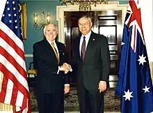 Howard outlined his support for retaining the status quo on the basis that it had provided a long period of stability and whilst he said there was no question that Australia was a fully independent nation, he believed that the "separation of the ceremonial and executive functions of government" and the presence of a neutral "defender of constitutional integrity" was an advantage in government and that no republican model would be as effective in providing such an outcome as the Australian constitutional monarchy.[39] Tim Fischer said that the Australian Constitution had delivered one of the "oldest continuous federated democracies in the world" and that changing it would be a complex operation: "The case for changing our mighty Constitution which has helped modernise Australia remains distant, divided and ill-defined. I say: stay with a system that works and works well".[40] Peter Costello also rejected any suggestion that Australia was not already an independent nation, but said that, while the Australian Constitution works "remarkably well", it was the institution of monarchy that was the crux of his argument for change: " The temper of the times is democratic; we are uncomfortable with an office that appoints people by hereditary. In our society in our time we prefer appointment by merit".[41]