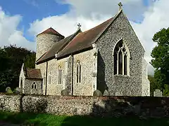Howe, from the Old Norse word haugr, is a Middle English topographic name for someone who lived by a small hill or a man-made mound or barrow. St Mary's church is one of 124 existing round-tower churches in Norfolk, showing many signs of construction in the Anglo-Saxon period, such as tall proportions, splayed porthole windows, and flint quoins. The ample-sized tower dates from the pre-Conquest period, being one of a series of Saxon round towers in Norfolk that demonstrate that the round tower design is at least 1000 years old. Several other features are of interest to the student of local church architecture. The church can be reached from Poringland, approx. 2 km away, along a lane through an open arable field, where another, later, round tower can be seen. There is a regular bus service from Norwich.