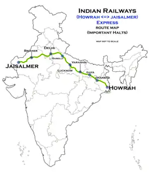 The 12371 / 12372 Howrah–Jaisalmer Superfast Express is a Superfast Express train of the Indian Railways connecting Howrah Junction in West Bengal and Jaisalmer of Rajasthan. It is currently being operated with 12371/12372 train numbers on a weekly basis.[1][2][3]
