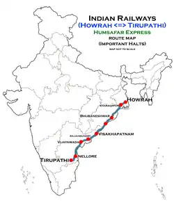 The 20889 / 20890 Howrah–Tirupati Humsafar Express is a completely 3-tier AC sleeper trains of the Indian Railways connecting Howrah in West Bengal and Tirupati in Andhra Pradesh. It is currently being operated with 20889/20890 train numbers on a weekly basis.