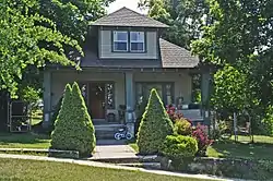 It is a one-and-a-half-story bungalow with narrow lap siding. It has a full width front porch, supported by four square columns, under its hipped roof.[2]