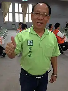 Hsieh led the Taichung chapter of the Democratic Progressive Party and served two terms on the Taichung City Council from 1994 to 2002. He helped run the legislative campaigns of Michael Tsai and led presidential candidate Chen Shui-bian's Taichung campaign in 2000.[1][2] Hsieh was elected to the Legislative Yuan for the first time in December 2001 and reelected in December 2004.[1][2] He lost reelection in 2008 and later ended his 2009 Taichung mayoral campaign, allowing Lin Chia-lung to represent the Democratic Progressive Party.[3][4][5] Hsieh launched another legislative campaign in 2012 before winning a Taichung municipal election in 2014.