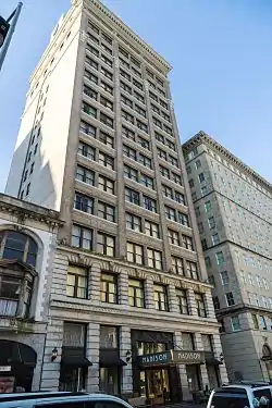 Built in 1905, the 14-story Tennessee Trust Building was among downtown Memphis' first "skyscrapers." The building's architects, the firm of Charles 0. Pfeil (1871–1952) and George M. Shaw (1870–1919) were noted at the time for designing buildings with ornate, classical styling and massing. The building was constructed with a large underground vault, which is currently re-purposed as the hotel gym. The scroll pattern on the west facade of the Tennessee Trust Building is visible on other downtown Memphis buildings from the era designed by Shaw & Pfeil. For instance, the firm's Memphis Fire Engine House #1 (1910) and the Memphis Police Station (1911) are on the National Register of Historic Places.[4] The Tennessee Trust Building was added to the National Register of Historic Places in 1982.[5]