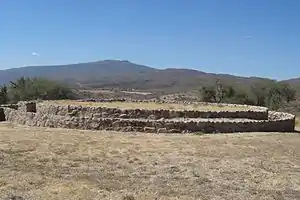 It is located at the northernmost edge of the sunken patio-altar complex. It consists of two concentric stone circles, the outer circle measuring about 20 meters (65 ft.) in diameter, with no other visible structural remains. The circle is not complete, its south side, facing the altar is flat against the altar structure.[2]