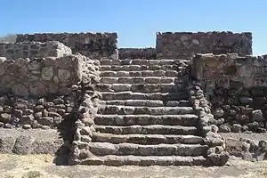 The sunken patio, on its northern side, has a stairway leading to a structure with several level platforms and remains of a structure, which possibly was an altar, related to events taking place in the complex.[2]