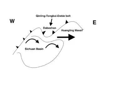 - During Lower Mesozoic, the northern notch of Qinling-Dabie belt and the clockwise rotation of the Sichuan Basin squeezed Huangling massif to escape to the east, forming an asymmetric ramp anticline trending N-S with steeper eastern flank and gentler western flank.[3] Controversy arose that the eastern flank of the anti-dome is steeper than the western flank, which is not fitting the geometry of the Huangling Anticline.[30][31]